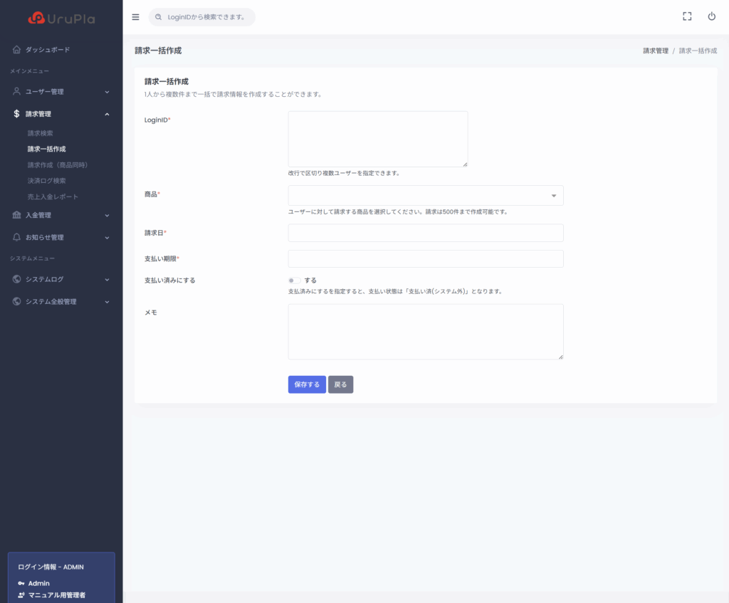 管理機能 管理者 請求管理 [請求一括作成] 2025.05.16 請求一括作成画面では、一括で請求情報を設定することができます。請求対象のLogin ID・商品・請求日・支払い期限は入力必須項目となります。「保存する」ボタンを押下すると請求一括作成がされます。