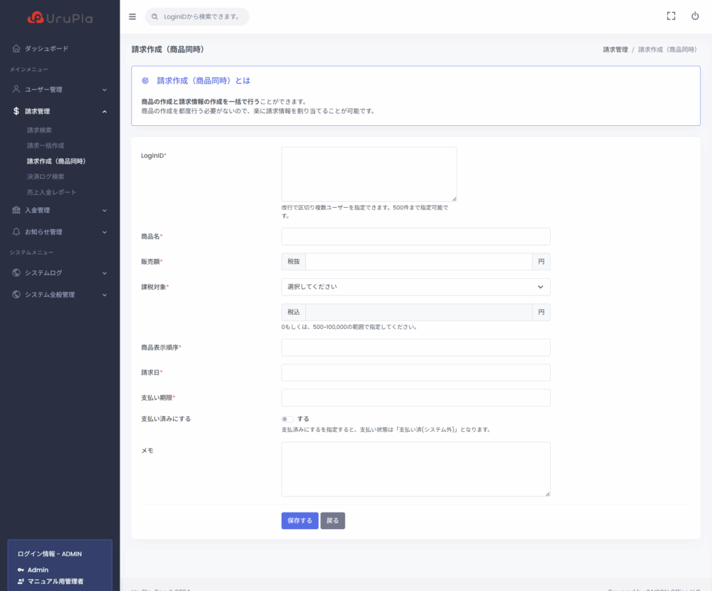 管理機能 管理者 請求管理 [請求作成(商品同時)] 2025.05.16 請求作成(商品同時)作成画面では、一括で請求情報と商品情報を作成することができます。Login ID・商品名・販売額・課税対象・商品表示順序・請求日・支払い期限は入力必須項目となります。「保存する」ボタンを押下すると請求情報と一緒に商品も作成がされます。