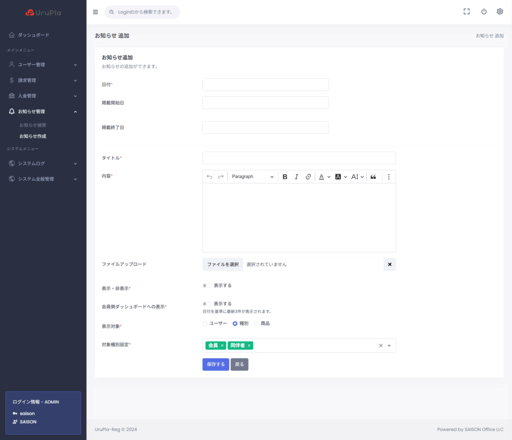 メニュー欄の「お知らせ管理」の「お知らせ作成」を押下すると、お知らせ追加画面が表示されます。