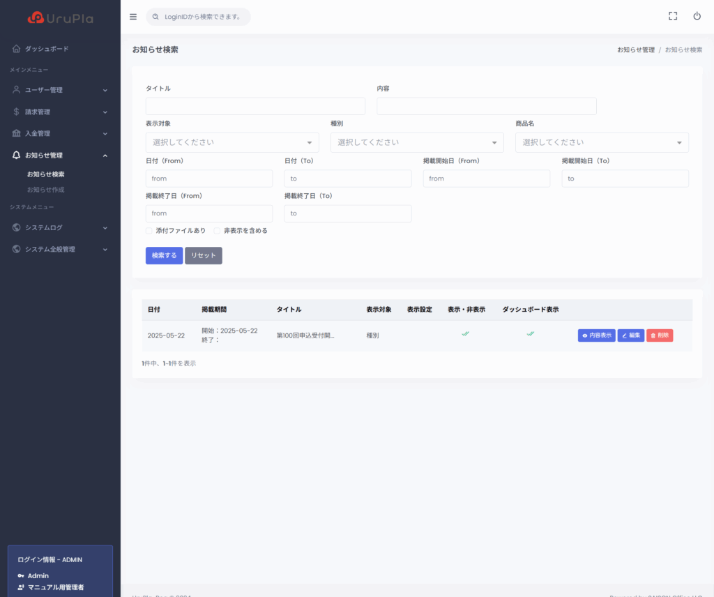 各お知らせは「内容表示」「編集」「削除」を選択することができます。「編集」の詳細は「管理者 お知らせ管理 [お知らせ作成 / 編集]」をご覧ください。