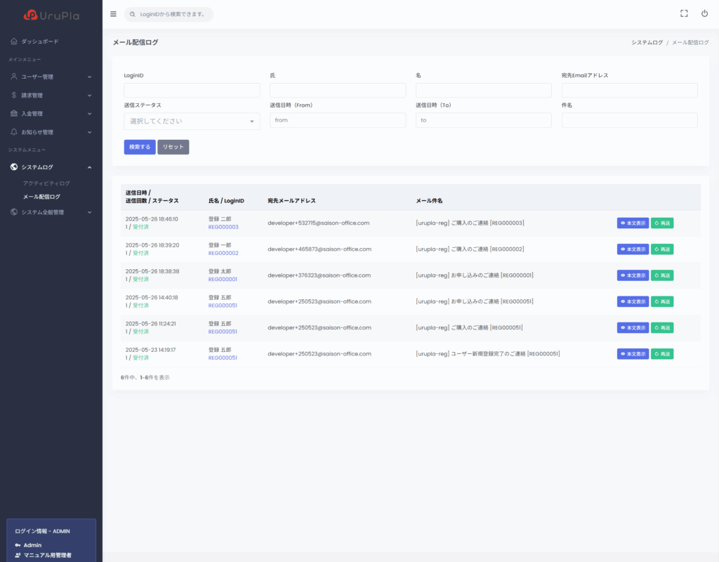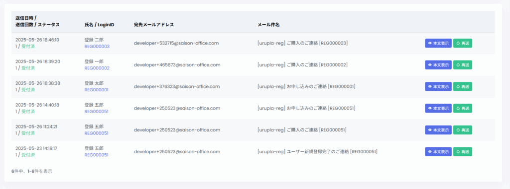 メール配信ログ画面では、ユーザーへのメール配信ログが一覧で表示されます。