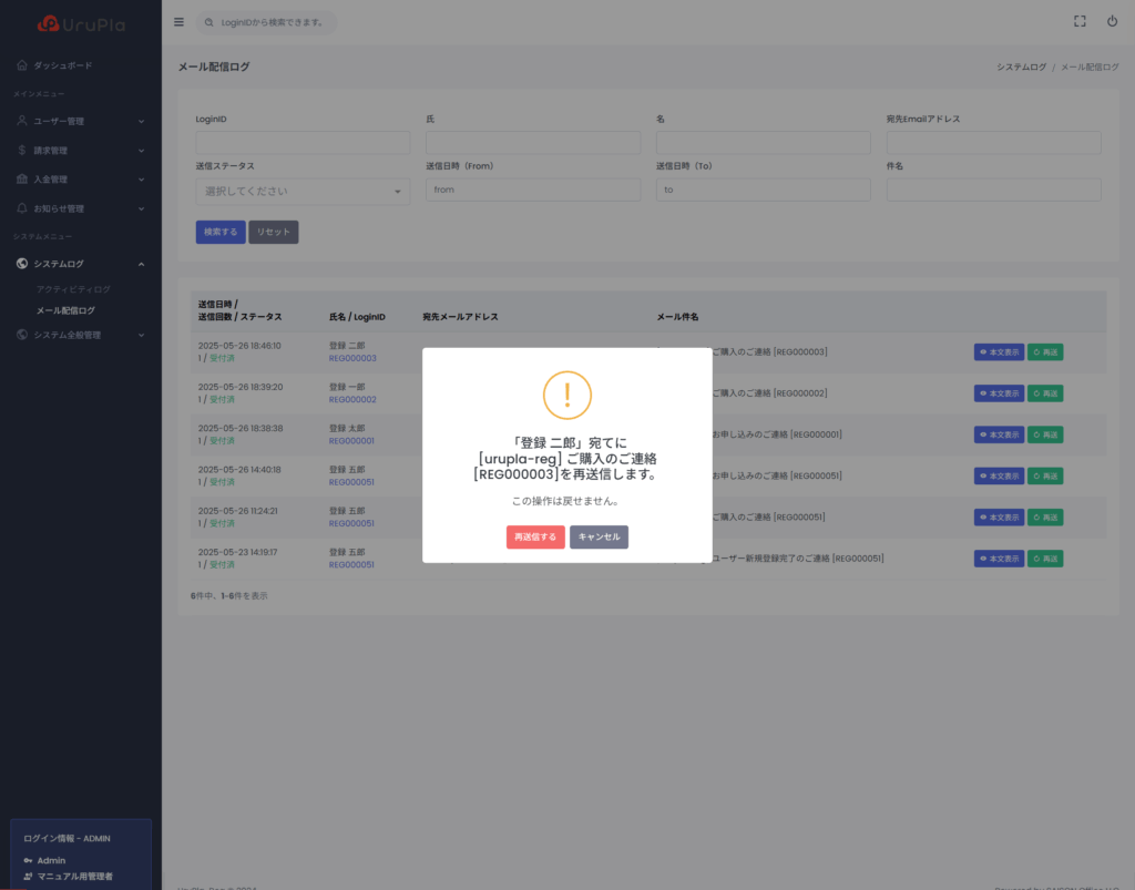 各メール配信ログの「再送」ボタンを押下すると選択したメール配信ログを再送することができます。確認アラートが表示されますので、「再送信する」ボタンを押下すると再送を実行することができます。