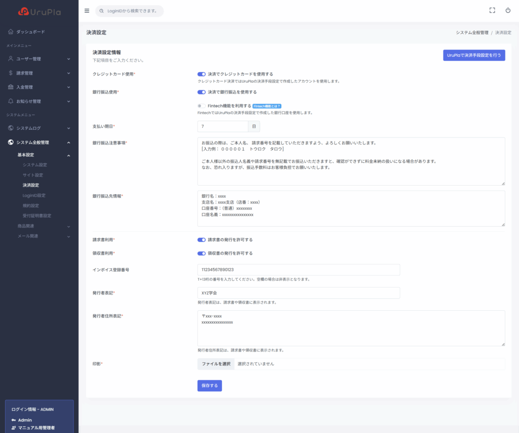 決済設定画面では、システムで提供する決済の内容を設定します。